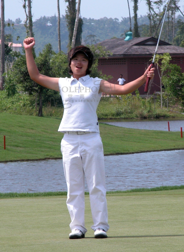 【golftime讯】2006年亚洲女子巡回赛第三站——马来西亚公开赛3月4日进行决赛轮的比赛,本站赛事总奖金为10万美金。第二轮比赛结束后,有61名选手成功晋级,其中中国内地选手有7名选手晋级决赛,她们是钟笑龙、张娜、陈小红、尚林艳、张林、王纯和魏俊萍。决赛轮结束后,韩国选手JI, EUN HEE以214杆的总成绩,获得冠军。泰国选手GULYANAMITTA, RUSSAMEE、韩国选手LEE, JEONG EUN 3与威尔士选手PILGRIM, ELEANOR排在并列第二。中国内地选手钟笑龙以223杆的总成绩,排名并列第16。图为地恩熹庆祝自己夺冠。