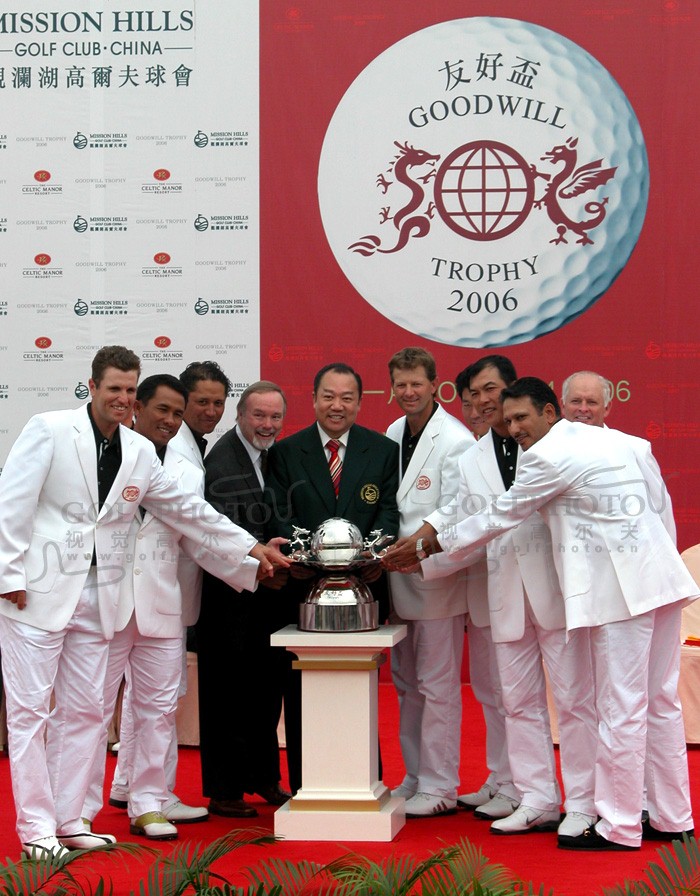 【golftime讯】首届“友好杯”于2006年11月14日在观澜湖尼克劳斯设计的世界杯球场进行了个人赛的角逐。第一天的四人两球赛结束后,国际队以2.5:1.5的比分取得胜利。今天经过紧张激烈的角逐,国际队最终以6.5:5.5的1分优势取得胜利。图为国际队赢得友好杯。