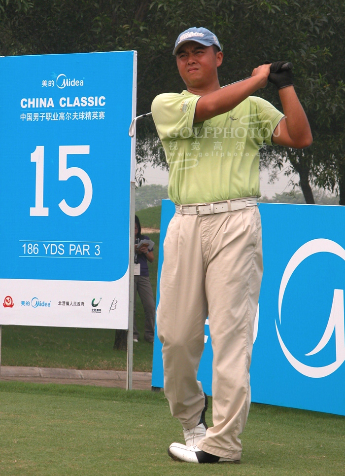 【golftime讯】总奖金168万元的“美的”中国男子职业精英赛于2006年10月20日在广东顺德君兰国际高尔夫俱乐部战罢第二轮。中国名将张连伟今天发挥出色,打出67杆-5的成绩,两轮的成绩为136杆-8排名升至第一位。两轮后共有60名选手成功晋级决赛轮的赛事,业余选手仅韩韧发挥稳定晋级;赞助商特邀的9位港台选手都成功晋级。图为黄明杰在第15洞开球。