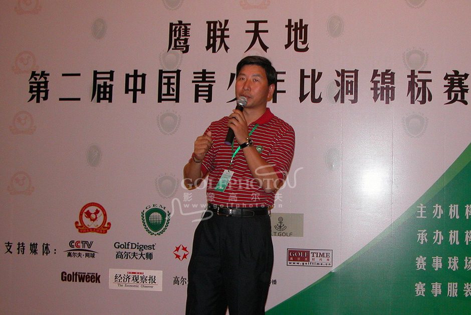 【golftime讯】由中国高尔夫球协会主办、北京鹰联天地高尔夫管理有限公司(GEM)策划承办的 “鹰联天地第二届中国青少年比洞锦标赛”于5月7日至10日在北京华堂国际高尔夫球俱乐部举行。5月6日为选手练习日,当晚还举行了欢迎晚宴。图为赛事总监马福生在欢迎晚宴上介绍赛事。